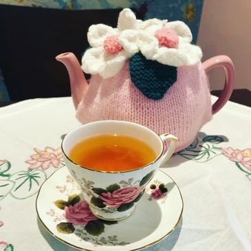 Black, Green, flavoured, fruit infusion. They all taste delicious when the loose leafs are brewed in our teapots with flower cosies to keep the tea warm so you can slowly sip from our vintage china cups.